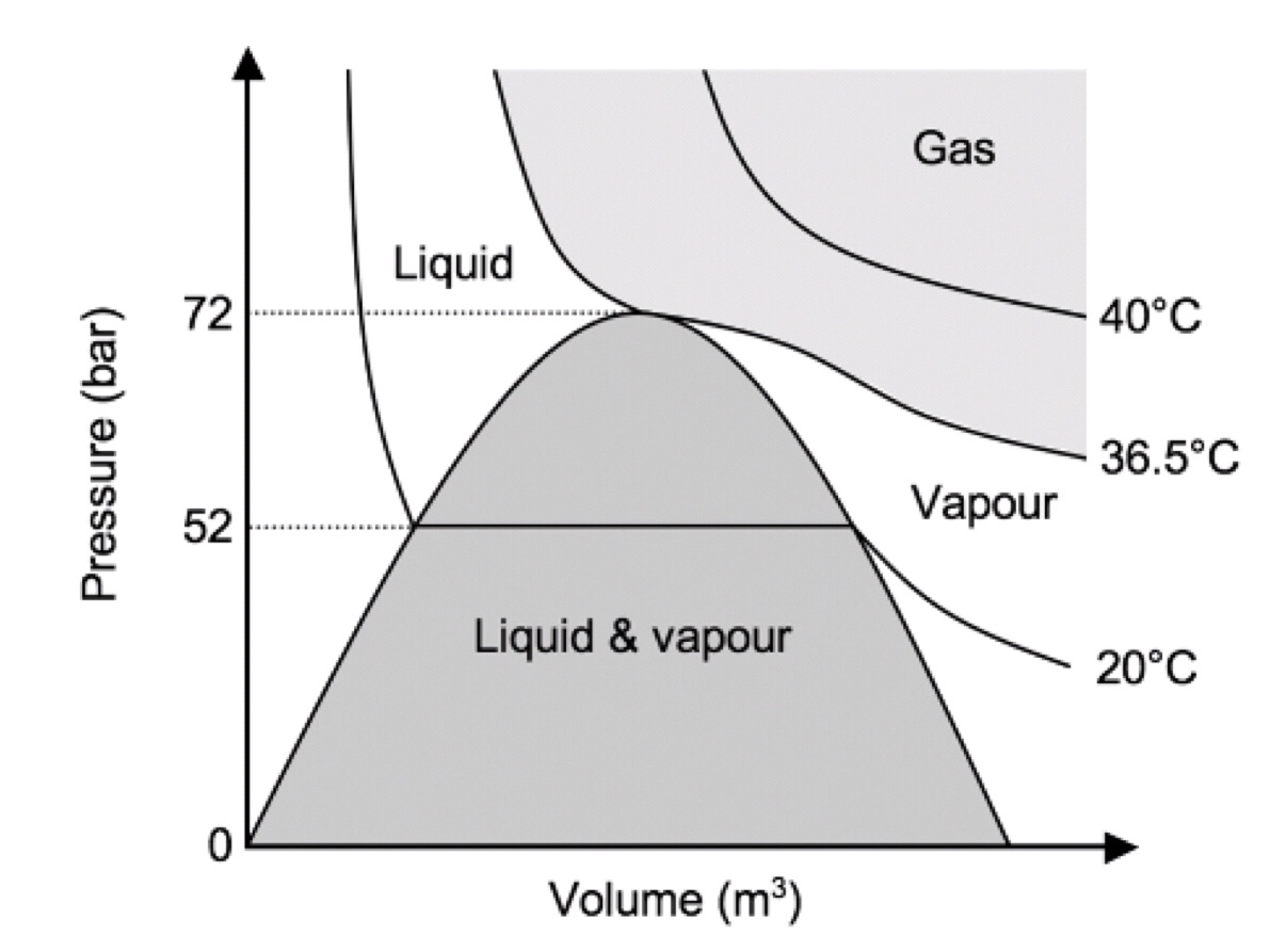 At 20°C, once the pressure reaches 52 bar (the saturated vapour pressure of nitrous oxide at 20°C), some of the gas condenses so that liquid and vapour are both present. Further decreases in volume cause more vapour to condense, with no associated rise in pressure. When all the vapour has condensed to a liquid, any further reduction in volume causes a rapid rise in pressure.