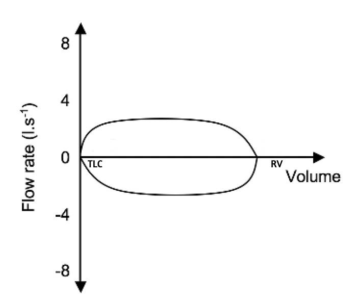 • Then inspiration occurs from RV to TLC in a right to left direction to achieve a flow rate of 4-6 l/sec and has a squarer shape