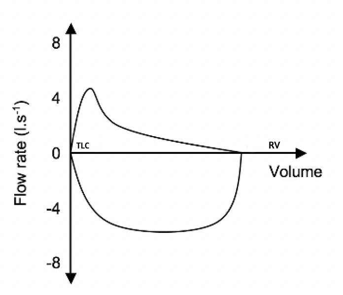 • The loop rises rapidly to a flow rate of 8-10 l/sec followed by a steady decrease as the expiration continue from left to right- the patient will be unable to cross the maximal flow line because of the dynamic compression of the airways. So the normal loop represents the maximum flow rate at each lung volume