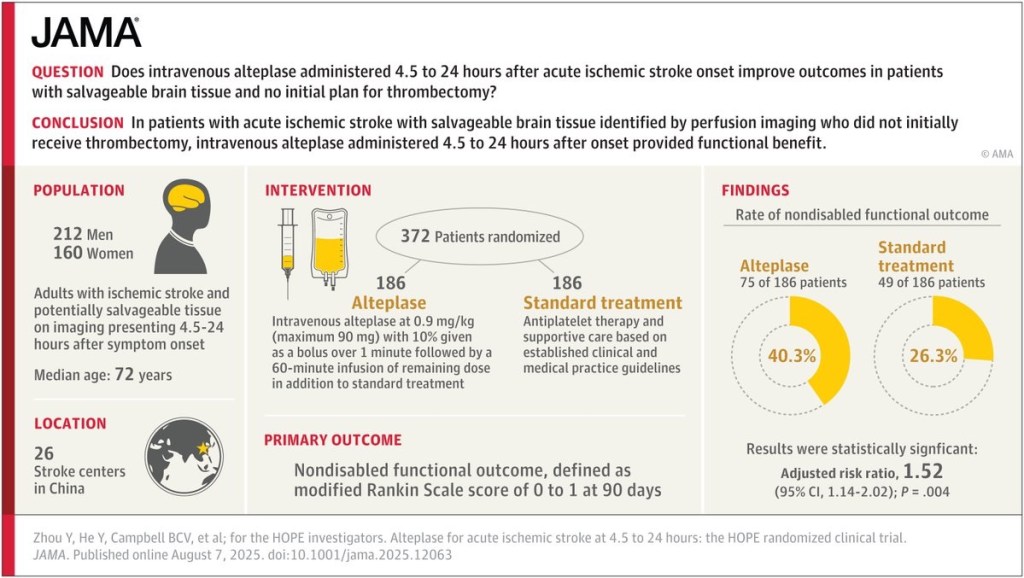 Does intravenous alteplase administered 4.5 to 24 hours after acute ischemic stroke onset improve outcomes?