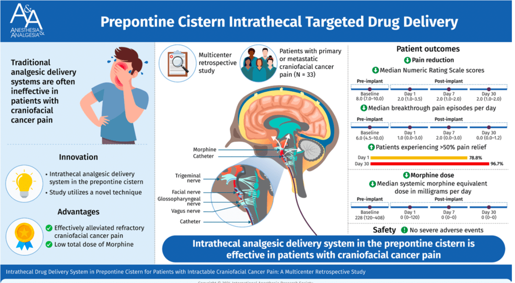 Placing the catheter tip of an intrathecal morphine pump into the prepontine cistern could effectively relieve refractory craniofacial cancer pain with an extremely low total morphine dose requirement and few adverse events. This procedure could be considered in patients with severe refractory craniofacial cancer pain. (Anesth Analg 2025;141:255–63)