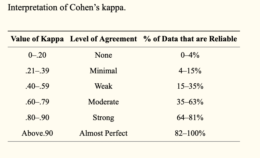 - Cohen suggested the Kappa result be interpreted as follows: values ≤ 0 as indicating no agreement and 0.01–0.20 as none to slight, 0.21–0.40 as fair, 0.41– 0.60 as moderate, 0.61–0.80 as substantial, and 0.81–1.00 as almost perfect agreement. But there are many arguments against this classification and a modified classification has been recommended